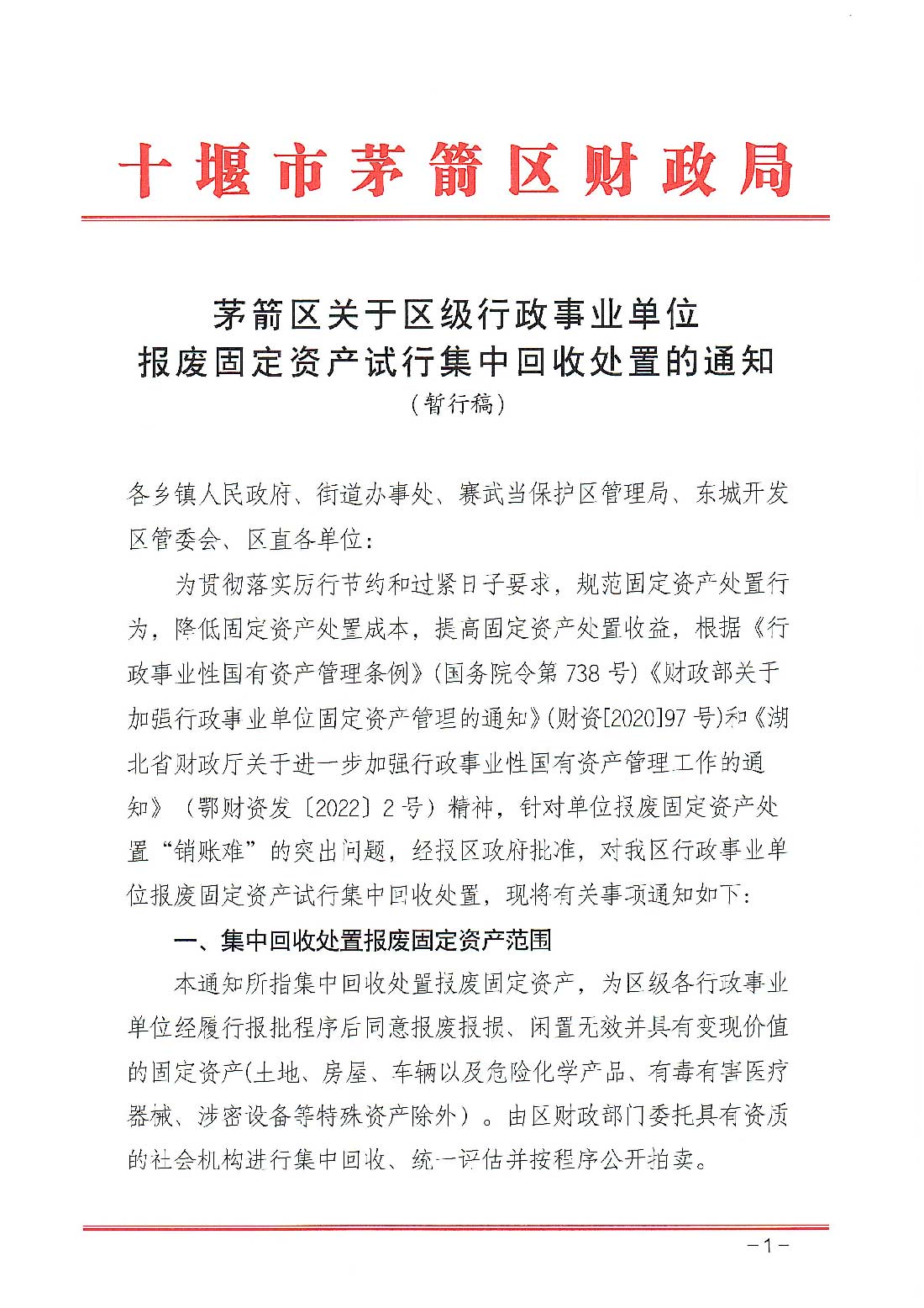 入圍茅箭區(qū)財政局行政事業(yè)單位報廢固定資產(chǎn)試行集中回收處置機(jī)構(gòu)。(暫行稿)