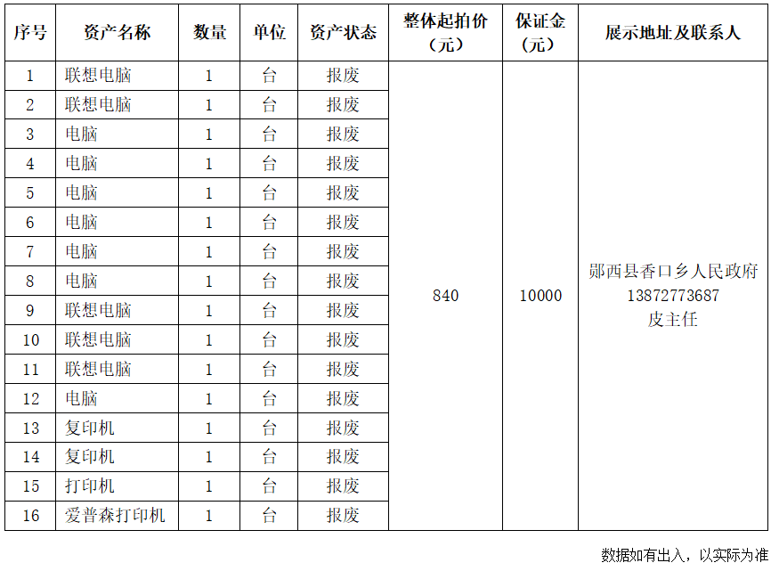 1.湖北省十堰市鄖西縣香口鄉(xiāng)人民政府報廢資產(chǎn):