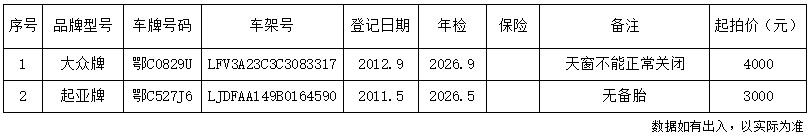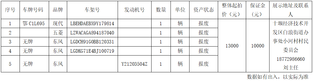 ]]>一、拍賣標(biāo)的: ??湖北省十堰經(jīng)濟(jì)技術(shù)開發(fā)區(qū)白浪街道辦事處小河村村民委員會(huì)報(bào)廢車輛: